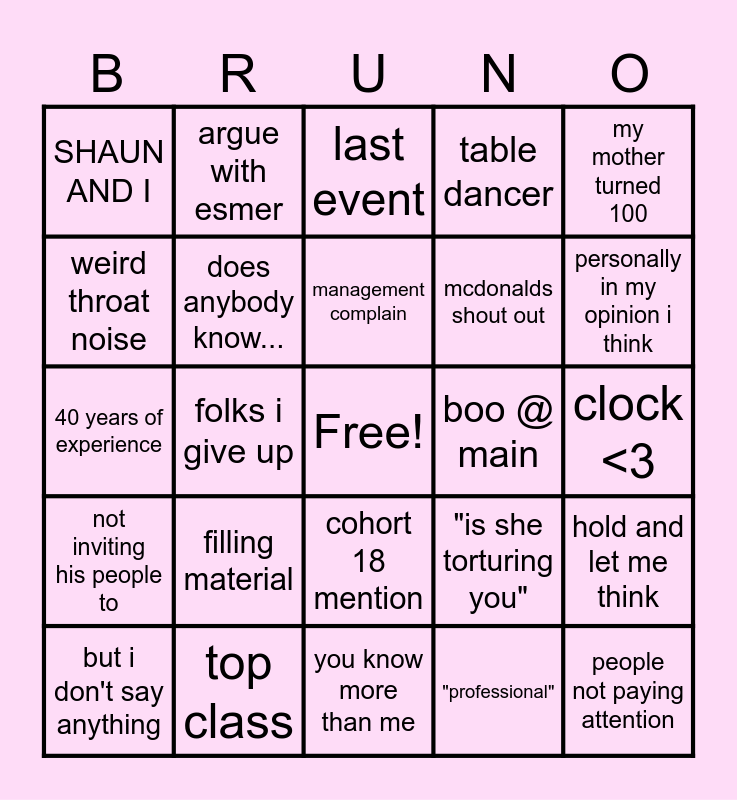 This bingo card has a free space and 24 words: filling material, top class, management complain, but i don't say anything, my mother turned 100, SHAUN AND I, weird throat noise, argue with esmer, boo @ main, cohort 18 mention, mcdonalds shout out, 40 years of experience, "is she torturing you", hold and let me think, does anybody know..., "professional", clock <3, last event, personally in my opinion i think, folks i give up, people not paying attention, not inviting his people to, table dancer and you know more than me.