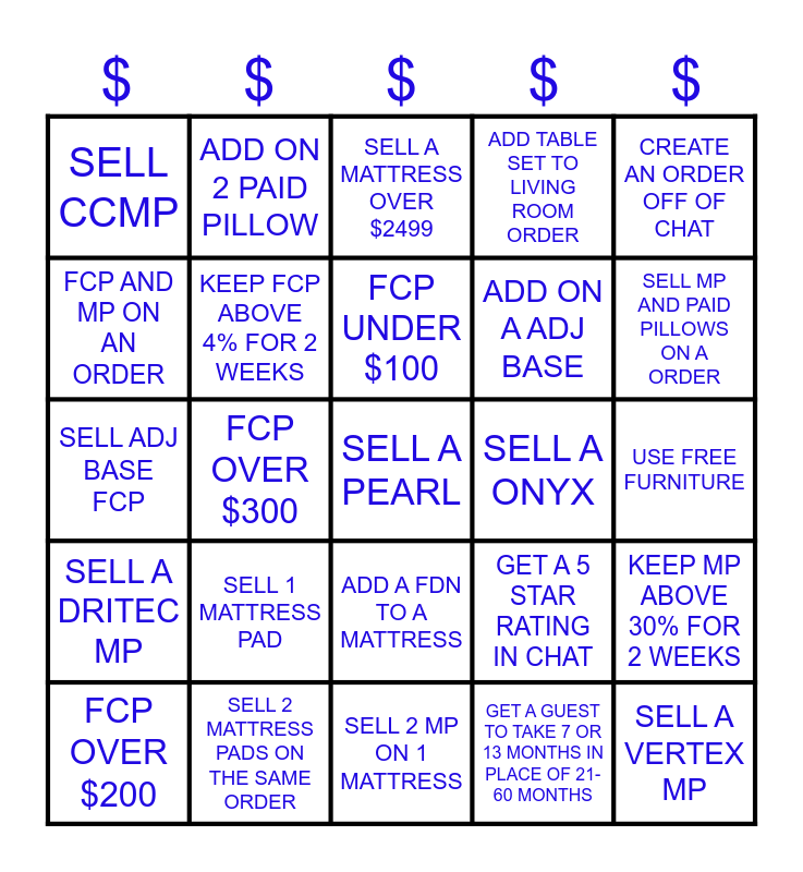 This bingo card has a free space and 24 words: SELL 1 MATTRESS PAD, SELL 2 MATTRESS PADS ON THE SAME ORDER, FCP UNDER $100, FCP OVER $200, CREATE AN ORDER OFF OF CHAT, SELL CCMP, FCP AND MP ON AN ORDER, ADD ON 2 PAID PILLOW, SELL A ONYX, ADD A FDN TO A MATTRESS, ADD ON A ADJ BASE, SELL ADJ BASE FCP, GET A 5 STAR RATING IN CHAT, KEEP MP ABOVE 30% FOR 2 WEEKS, KEEP FCP ABOVE 4% FOR 2 WEEKS, GET A GUEST TO TAKE 7 OR 13 MONTHS IN PLACE OF 21-60 MONTHS, USE FREE FURNITURE, SELL A MATTRESS OVER $2499, SELL MP AND PAID PILLOWS ON A ORDER, FCP OVER $300, SELL A VERTEX MP, SELL A DRITEC MP, ADD TABLE SET TO LIVING ROOM ORDER and SELL 2 MP ON 1 MATTRESS.