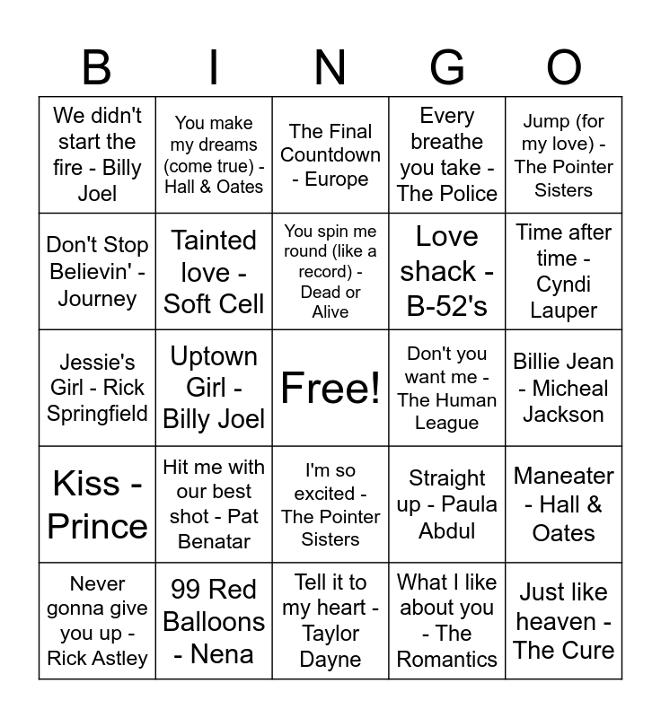 This bingo card has a free space and 64 words: Africa - Toto, Faith - George Michael, Sweet Dreams (are made of this) Eurythmics, Maneater - Hall & Oates, Karma Chameleon - Culture Club, Beat It - Michael Jackson, You make my dreams (come true) - Hall & Oates, Your Love - The Outfield, You spin me round (like a record) - Dead or Alive, I wanna dance with somebody (who loves me) - Whitney Houston, I'm so excited - The Pointer Sisters, It's still rock and roll to me - Billy Joel, Billie Jean - Micheal Jackson, Jump (for my love) - The Pointer Sisters, All night long - Lionel Richie, Don't Stop Believin' - Journey, Uptown Girl - Billy Joel, We didn't start the fire - Billy Joel, We built this city - Starship, Love shack - B-52's, Hit me with our best shot - Pat Benatar, Kiss - Prince, Every breathe you take - The Police, Who can it be now? - Men at work, Down under - Men at Work, I'm gonna be (500 miles) - The Proclaimers, Keep on loving you - REO Speedwagon, Let's Dance - David Bowie, Wake me up before you go-go - Wham!, Hungry like the wolf - Duran Duran, Tak on me - a-ha, Girls just want to have fun - Cyndi Lauper, Material Girl - Madonna, My prerogative - Bobby Brown, Time after time - Cyndi Lauper, Never gonna give you up - Rick Astley, Walk like and Egyptian - The Bangles, What I like about you - The Romantics, Whip it - Devo, Tainted love - Soft Cell, Jessie's Girl - Rick Springfield, Don't you want me - The Human League, Nothing's gonna stop us now - Starship, Rock the Casbah - The Clash, What a feeling - Irene Cara, Just like heaven - The Cure, 99 Red Balloons - Nena, Thriller - Michael Jackson, Straight up - Paula Abdul, Take me home tonight - Eddie Money, You got it - Roy Orbison, Take my breath away - Berlin, Tell it to my heart - Taylor Dayne, The power of love - Huey Lewis & The News, Total eclipse of the heart - Bonnie Tyler, Easy lover - Philip Bailey & Phil Collins, The Final Countdown - Europe, Come on Eileen - Dexys Midnight Runners, She drives me crazy - Fine Young Cannibals, Dancing in the dark - Bruce Springsteen, I want to know what love is - Foreigner, Sunglasses at night - Corey Hart, Relax - Frankie Goes to Hollywood and I think we're alone now - Tiffany.