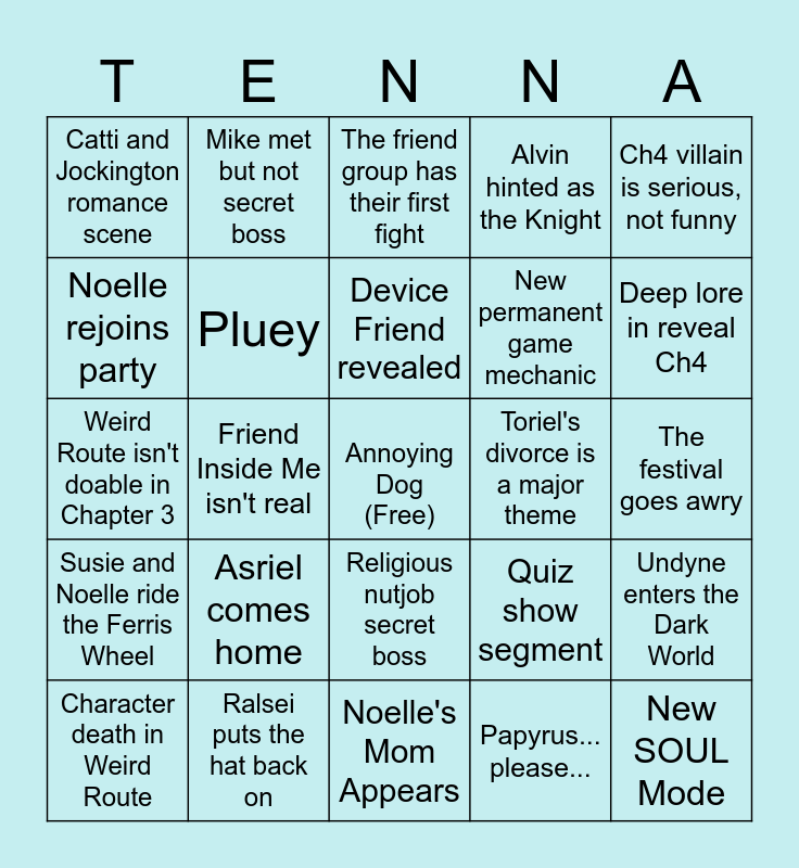 This bingo card has a free space and 24 words: Asriel comes home, Ralsei puts the hat back on, Device Friend revealed, Character death in Weird Route, Ch4 villain is serious, not funny, Catti and Jockington romance scene, Noelle rejoins party, Mike met but not secret boss, Toriel's divorce is a major theme, Religious nutjob secret boss, New permanent game mechanic, Weird Route isn't doable in Chapter 3, Quiz show segment, Undyne enters the Dark World, Pluey, Papyrus... please..., The festival goes awry, The friend group has their first fight, Deep lore in reveal Ch4, Friend Inside Me isn't real, New SOUL Mode, Susie and Noelle ride the Ferris Wheel, Alvin hinted as the Knight and Noelle's Mom Appears.