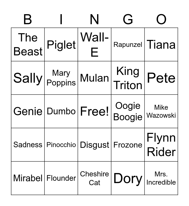 This bingo card has a free space and 126 words: Belle, Maleficent, Evil Queen, Ursula, Ariel, Joy, Sadness, Lightning McQueen, Dory, Nemo, Lilo, Stitch, Snow White, Moana, Aurora, Gaston, Flounder, Sebastian, Maui, Jasmine, Aladdin, Genie, Jafar, Pocahontas, Tarzan, Mulan, Rapunzel, Elsa, Anna, Kristoff, Flynn Rider, Cinderella, Dumbo, Pinocchio, Woody, Buzz Lightyear, Jessie, Bo Peep, Lotso, Bullseye, The Beast, Merida, Hercules, Hades, Winnie the Pooh, Tigger, Eeyore, Tiana, Lottie, Dr. Facilier, Prince Naveen, Peter Pan, Wendy, Captain Hook, Tinker Bell, Hans, Olaf, Sven, Jack Skellington, Oogie Boogie, Sally, Zero, Dopey, Grumpy, Anxiety, Fear, Anger, Disgust, Sully, Mike Wazowski, Boo, Simba, Timon, Pumba, Scar, Mufasa, Mater, Donald Duck, Mickey Mouse, Minnie Mouse, Goofy, Daisy Duck, Pluto, Cruella de Vil, Mirabel, Bruno, Jack Sparrow, Alicw, Cheshire Cat, Queen of Hearts, Yzma, Kuzco, Bambi, Mary Poppins, Roger Rabbit, Wall-E, Eve, Russell, Doug, Mr. Incredible, Mrs. Incredible, Edna Mode, Frozone, Mad Hatter, Marie, Jiminy Cricket, Chip, Dale, Pete, Max, Mushu, John Smith, Quasimodo, Esmerelda, Count Frollo, Lumiere, Le Fou, Chip, Mrs. Potts, Cogsworth, King Triton, Prince Eric, Prince Phillip, Mother Gothel, Piglet and Christopher Robin.