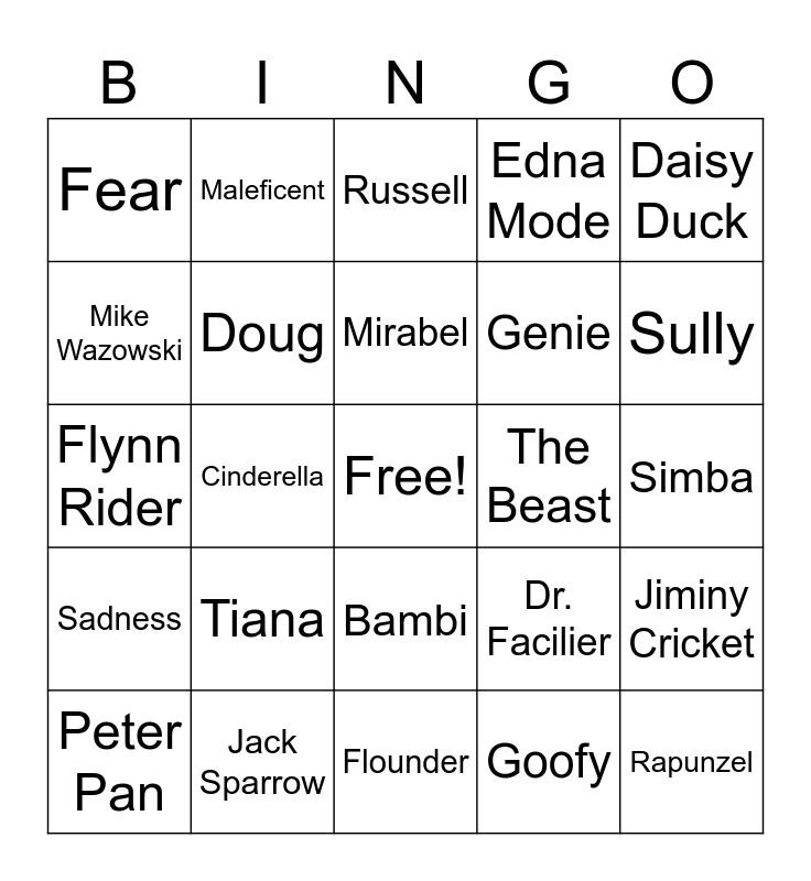 This bingo card has a free space and 129 words: Belle, Maleficent, Evil Queen, Ursula, Ariel, Joy, Sadness, Lightning McQueen, Dory, Nemo, Lilo, Stitch, Snow White, Moana, Aurora, Gaston, Flounder, Sebastian, Maui, Jasmine, Aladdin, Genie, Jafar, Pocahontas, Tarzan, Mulan, Rapunzel, Elsa, Anna, Kristoff, Flynn Rider, Cinderella, Dumbo, Pinocchio, Woody, Buzz Lightyear, Jessie, Bo Peep, Lotso, Bullseye, The Beast, Merida, Hercules, Hades, Winnie the Pooh, Tigger, Eeyore, Tiana, Lottie, Dr. Facilier, Prince Naveen, Peter Pan, Wendy, Captain Hook, Tinker Bell, Hans, Olaf, Sven, Jack Skellington, Oogie Boogie, Sally, Zero, Dopey, Grumpy, Anxiety, Fear, Anger, Disgust, Sully, Mike Wazowski, Boo, Simba, Timon, Pumba, Scar, Mufasa, Mater, Donald Duck, Mickey Mouse, Minnie Mouse, Goofy, Daisy Duck, Pluto, Cruella de Vil, Mirabel, Bruno, Jack Sparrow, Alice, Cheshire Cat, Queen of Hearts, Yzma, Kuzco, Bambi, Mary Poppins, Roger Rabbit, Wall-E, Eve, Russell, Doug, Mr. Incredible, Mrs. Incredible, Edna Mode, Frozone, Mad Hatter, Marie, Jiminy Cricket, Chip, Dale, Pete, Max, Mushu, John Smith, Quasimodo, Esmerelda, Count Frollo, Lumiere, Le Fou, Mrs. Potts, Cogsworth, King Triton, Prince Eric, Prince Phillip, Mother Gothel, Piglet, Christopher Robin, Pascal, Maximus, Li Shang and Bolt.