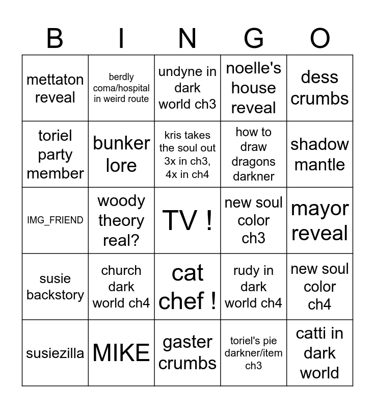 This bingo card has a free space and 24 words: church dark world ch4, MIKE, kris takes the soul out 3x in ch3, 4x in ch4, susiezilla, dess crumbs, mettaton reveal, toriel party member, berdly coma/hospital in weird route, new soul color ch3, cat chef !, how to draw dragons darkner, IMG_FRIEND, rudy in dark world ch4, new soul color ch4, bunker lore, toriel's pie darkner/item ch3, mayor reveal, undyne in dark world ch3, shadow mantle, woody theory real?, catti in dark world, susie backstory, noelle's house reveal and gaster crumbs.