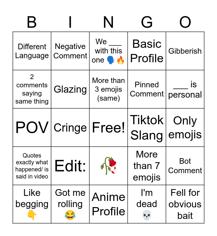 This bingo card has a free space and 24 words: Edit:, Got me rolling 😂, More than 3 emojis (same), Like begging 👇, Gibberish, Different Language, 2 comments saying same thing, Negative Comment, Tiktok Slang, 🥀, Pinned Comment, POV, More than 7 emojis, Bot Comment, Glazing, I'm dead 💀, Only emojis, We ___ with this one 🗣️🔥, ___ is personal, Cringe, Fell for obvious bait, Quotes exactly what happened/ is said in video, Basic Profile and Anime Profile.