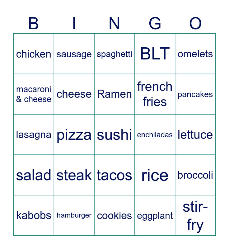 This bingo card has 30 words: hamburger, fish, pizza, eggs, chicken, spaghetti, cheese, tacos, enchiladas, cookies, lettuce, sushi, eggplant, stir-fry, pancakes, soup, rice, salad, steak, omelets, lasagna, salmon, sausage, french fries, macaroni & cheese, BLT, broccoli, kabobs, Ramen and Nachos.