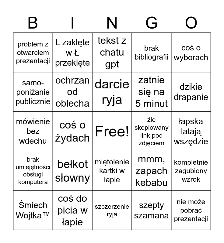 This bingo card has a free space and 24 words: Śmiech Wojtka™, bełkot słowny, darcie ryja, szepty szamana, coś o wyborach, problem z otwarciem prezentacji, L zaklęte w Ł przeklęte, tekst z chatu gpt, źle skopiowany link pod zdjęciem, łapska latają wszędzie, mówienie bez wdechu, ochrzan od oblecha, mmm, zapach kebabu, kompletnie zagubiony wzrok, samo-poniżanie publicznie, coś do picia w łapie, szczerzenie ryja, brak bibliografii, dzikie drapanie, brak umiejętności obsługi komputera, coś o żydach, miętolenie kartki w łapie, zatnie się na 5 minut and nie może pobrać prezentacji.