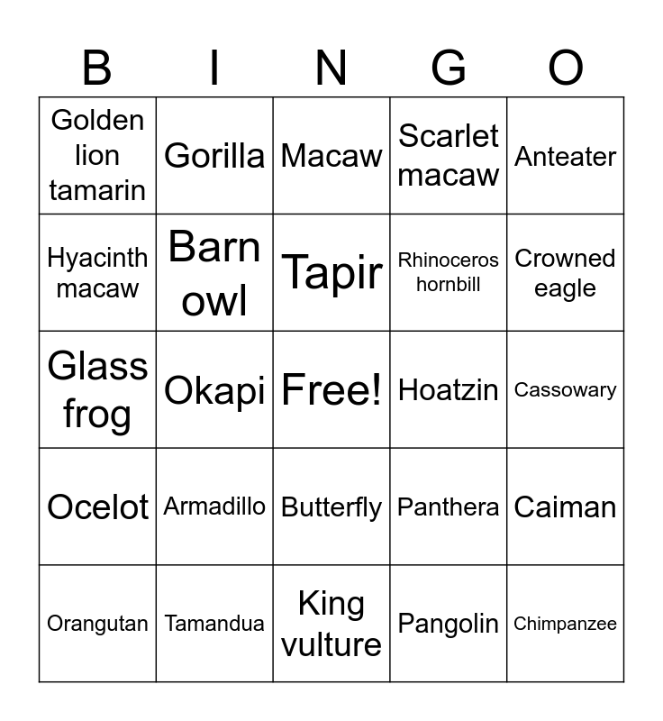 This bingo card has a free space and 39 words: Black Panther, Cockatoo, Squirrel monkey, Barn owl, Orangutan, Butterfly, Tapir, Capybara, Anteater, Ocelot, Okapi, Scarlet macaw, Chimpanzee, Cassowary, Hoatzin, Armadillo, Kinkajou, Golden lion tamarin, Peccary, Panthera, Hyacinth macaw, King vulture, Rhinoceros hornbill, Crowned eagle, Crested guan, Poison dart frog, Red-eyed frog, Jaguar, Sloth, Gorilla, Toucan, Titan beetle, Macaw, Tamandua, Pangolin, Sun Bear, Caiman, Glass frog and Dirk-dirk.
