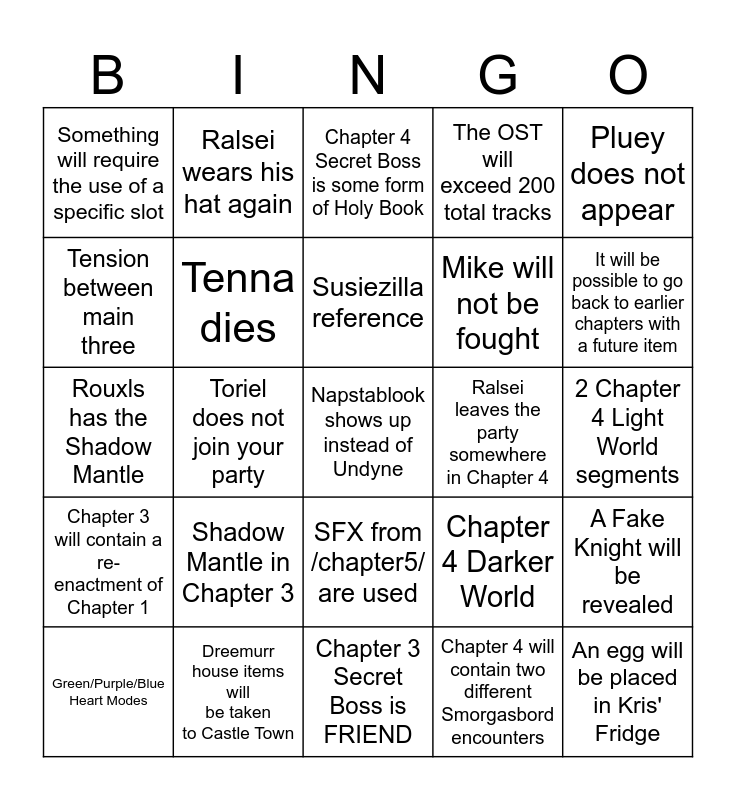This bingo card has 25 words: Shadow Mantle in Chapter 3, Chapter 3 Secret Boss is FRIEND, Susiezilla reference, Green/Purple/Blue Heart Modes, Pluey does not appear, Something will require the use of a specific slot, Tension between main three, Ralsei wears his hat again, Ralsei leaves the party somewhere in Chapter 4, SFX from /chapter5/ are used, Mike will not be fought, Rouxls has the Shadow Mantle, Chapter 4 Darker World, A Fake Knight will be revealed, Tenna dies, An egg will be placed in Kris' Fridge, 2 Chapter 4 Light World segments, Chapter 4 Secret Boss is some form of Holy Book, It will be possible to go back to earlier chapters with a future item, Toriel does not join your party, Napstablook shows up instead of Undyne, Dreemurr house items will be taken to Castle Town, Chapter 3 will contain a re-enactment of Chapter 1, The OST will exceed 200 total tracks and Chapter 4 will contain two different Smorgasbord encounters.