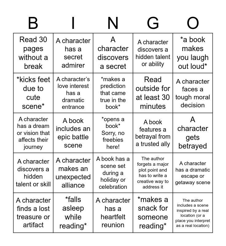 This bingo card has a free space and 29 words: A character finds a lost treasure or artifact, A character’s heart gets broken, A book includes an epic battle scene, A character delivers a powerful speech or monologue, Read 30 pages without a break, A character discovers a secret, A character’s love interest has a dramatic entrance, A character makes an unexpected alliance, A book features a betrayal from a trusted ally, *falls asleep while reading*, A character gets betrayed, The author includes a scene inspired by a real location (or a place you interpret as a real location), A character has a heartfelt reunion, *makes a snack for someone reading*, A character faces a tough moral decision, An author includes a typo in the book, A book has a scene set during a holiday or celebration, A character discovers a hidden talent or skill, *a book makes you laugh out loud*, A character has a dream or vision that affects their journey, The author forgets a major plot point and has to write a creative way to address it, A character has a dramatic escape or getaway scene, Read outside for at least 30 minutes, *kicks feet due to cute scene*, A character discovers a hidden talent or ability, A character has a secret admirer, A character has a dramatic escape or getaway scene, *makes a prediction that came true in the book* and *yelled at a character…out loud or mentally*.