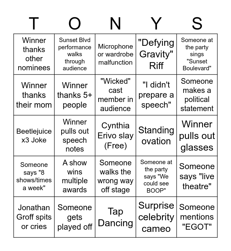 This bingo card has a free space and 28 words: Someone says "live theatre", Hamilton mega-mix performance, "I didn't prepare a speech", Surprise celebrity cameo, Winner thanks their mom, Microphone or wardrobe malfunction, Sunset Blvd performance walks through audience, Someone says "8 shows/times a week", Standing ovation, Jonathan Groff spits or cries, Beetlejuice x3 Joke, "Defying Gravity" Riff, Someone gets played off, Tap Dancing, Someone makes a political statement, Pride Month shoutout, A show wins multiple awards, Winner thanks 5+ people, "Wicked" cast member in audience, Someone walks the wrong way off stage, Winner thanks other nominees, Someone thanks a teacher, Someone mentions "EGOT", Winner pulls out speech notes, Winner pulls out glasses, Someone at the party says "We could see BOOP", Someone at the party sings "Sunset Boulevard" and Alison cries.