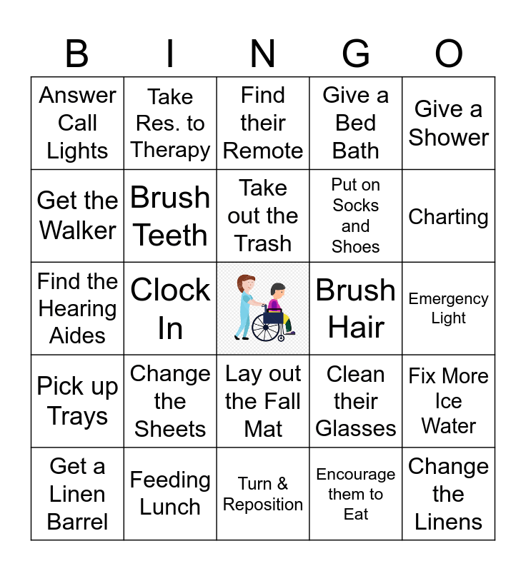 This bingo card has a free space and 24 words: Change the Sheets, Feeding Lunch, Take out the Trash, Get a Linen Barrel, Give a Shower, Answer Call Lights, Get the Walker, Take Res. to Therapy, Brush Hair, Lay out the Fall Mat, Put on Socks and Shoes, Find the Hearing Aides, Clean their Glasses, Fix More Ice Water, Brush Teeth, Encourage them to Eat, Emergency Light, Find their Remote, Charting, Clock In, Change the Linens, Pick up Trays, Give a Bed Bath and Turn & Reposition.