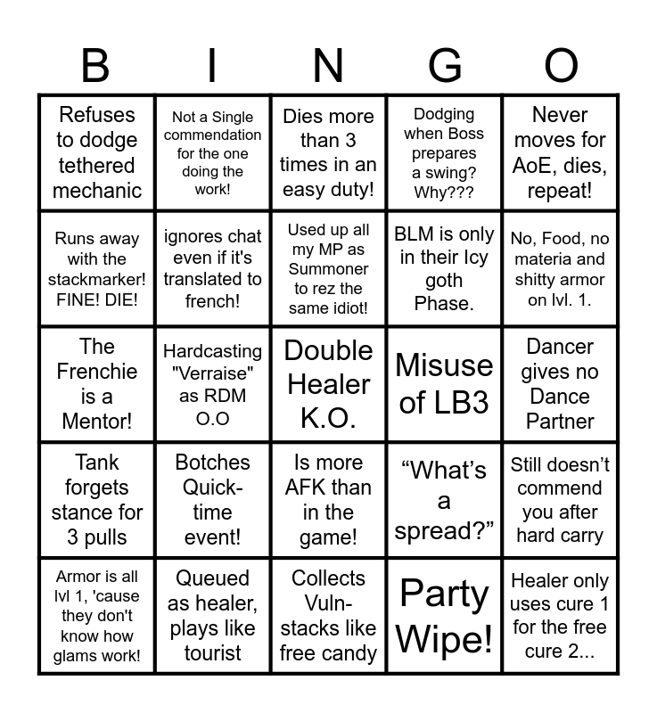 This bingo card has 25 words: Tank forgets stance for 3 pulls, Queued as healer, plays like tourist, Double Healer K.O., Party Wipe!, Never moves for AoE, dies, repeat!, Refuses to dodge tethered mechanic, Not a Single commendation for the one doing the work!, Dies more than 3 times in an easy duty!, Misuse of LB3, Still doesn’t commend you after hard carry, Runs away with the stackmarker! FINE! DIE!, ignores chat even if it's translated to french!, Collects Vuln-stacks like free candy, “What’s a spread?”, No, Food, no materia and shitty armor on lvl. 1., Armor is all lvl 1, 'cause they don't know how glams work!, Hardcasting "Verraise" as RDM O.O, Used up all my MP as Summoner to rez the same idiot!, BLM is only in their Icy goth Phase., Dancer gives no Dance Partner, The Frenchie is a Mentor!, Botches Quick-time event!, Is more AFK than in the game!, Dodging when Boss prepares a swing?Why??? and Healer only uses cure 1 for the free cure 2....