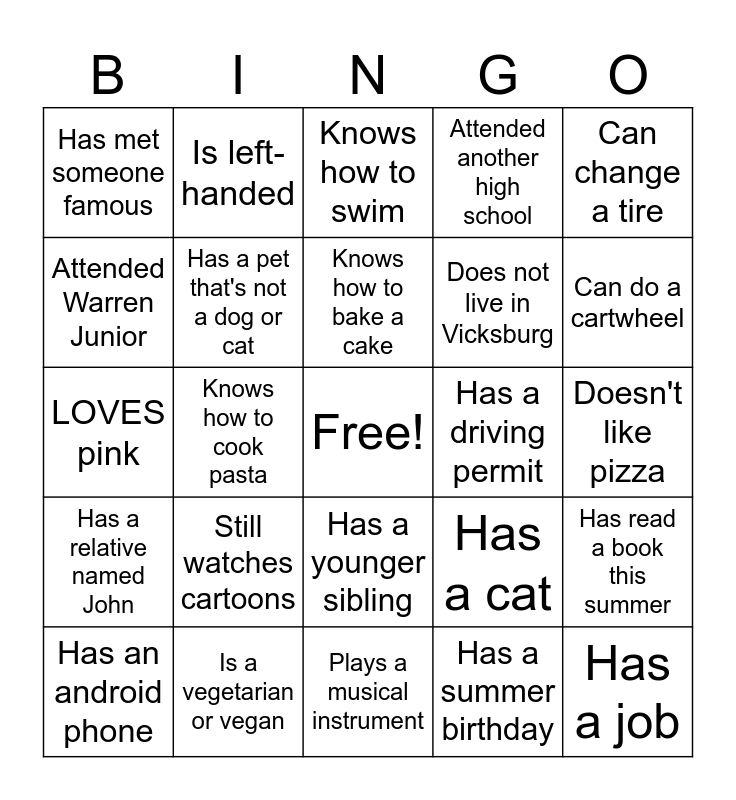 This bingo card has a free space and 54 words: Has a dog, Has a relative named John, Travelled out of state, Travelled out of the U.S., Has a younger sibling, Has an older sibling, Attended another high school, Attended Vicksburg Junior, Attended Warren Junior, Attended AOI, Has met someone famous, Likes chocolate, Is a vegetarian or vegan, Has an android phone, Sings in a choir, Plays a musical instrument, Has a job, Does not live in Vicksburg, Likes Chinese food, Doesn't like pizza, Has a cat, Has a driver's license, Has a driving permit, Can change a tire, Plays a school sport, Is left-handed, Speaks more than one language, Was born in a different state, Is an only child, Has a summer birthday, Has a birthday in the winter, Likes pineapple on pizza, Can whistle, Loves spicy food, Knows how to swim, Is in a club at school, LOVES pink, Has read a book this summer, I taller than 6 ft, Has a pet that's not a dog or cat, Has watched a movie more than 5x, Has watched all Harry Potter movies, Has read all Harry Potter books, Loves Marvel movies, Still watches cartoons, Has a game console, Has been to a music concert, Has visited more than 3 US states, Knows how to bake a cake, Knows how to cook pasta, Can do a cartwheel, Knows their zodiac sign, Has been in a play or musical and Has run a race.