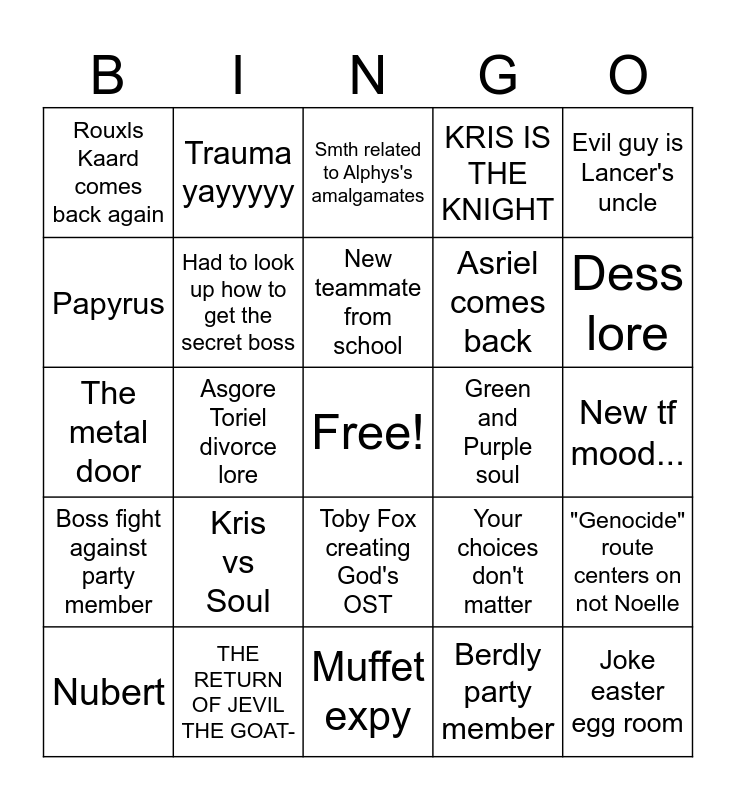 This bingo card has a free space and 24 words: Kris vs Soul, THE RETURN OF JEVIL THE GOAT-, New teammate from school, Nubert, Evil guy is Lancer's uncle, Rouxls Kaard comes back again, Papyrus, Trauma yayyyyy, Green and Purple soul, Toby Fox creating God's OST, Asriel comes back, The metal door, Your choices don't matter, "Genocide" route centers on not Noelle, Had to look up how to get the secret boss, Berdly party member, New tf mood..., Smth related to Alphys's amalgamates, Dess lore, Asgore Toriel divorce lore, Joke easter egg room, Boss fight against party member, KRIS IS THE KNIGHT and Muffet expy.