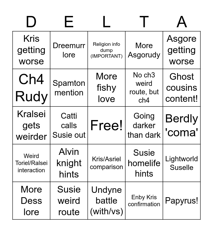 This bingo card has a free space and 24 words: Alvin knight hints, Susie weird route, More fishy love, More Dess lore, Asgore getting worse, Kris getting worse, Ch4 Rudy, Dreemurr lore, Going darker than dark, Kris/Asriel comparison, No ch3 weird route, but ch4, Kralsei gets weirder, Susie homelife hints, Lightworld Suselle, Spamton mention, Enby Kris confirmation, Berdly 'coma', Religion info dump (IMPORTANT), Ghost cousins content!, Catti calls Susie out, Papyrus!, Weird Toriel/Ralsei interaction, More Asgorudy and Undyne battle (with/vs).
