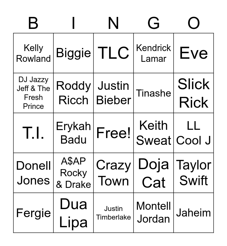 This bingo card has a free space and 29 words: Fergie, Blu Cantrell, Erykah Badu, Brownstone, Kelly Rowland, TLC, Roddy Ricch, A$AP Rocky & Drake, Keith Sweat, Dua Lipa, LL Cool J, Jaheim, Justin Timberlake, Montell Jordan, Slick Rick, Mary J. Blige, Crazy Town, Donell Jones, Eve, T.I., Doja Cat, Morgan Wallen, Tinashe, DJ Jazzy Jeff & The Fresh Prince, Kendrick Lamar, Biggie, Taylor Swift, Justin Bieber and Sean Paul.