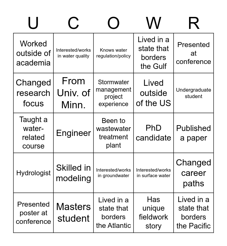 This bingo card has a free space and 33 words: Free!, First time at UCOWR, Engineer, Ecologist, Hydrologist, From Univ. of Minn., Presented at conference, Presented poster at conference, Interested/works in water quality, Skilled in GIS, Stormwater management project experience, Knows water regulation/policy, UCOWR/NIWR delegate, Works in extenstion, PhD candidate, Undergraduate student, Masters student, Taught a water-related course, Skilled in modeling, Interested/works in surface water, Interested/works in groundwater, Postdoctoral researcher, Worked outside of academia, Published a paper, Lived in a state that borders the Atlantic, Lived in a state that borders the Pacific, Lived in a state that borders the Gulf, Lived outside of the US, Changed research focus, Changed career paths, Has fun water fact, Has unique fieldwork story and Knows a coding language.