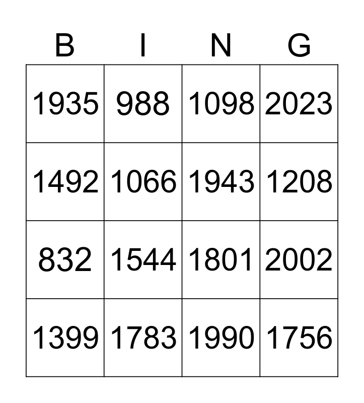 This bingo card has 36 words: 1976, 1401, 1939, 1943, 1231, 1756, 1208, 1637, 1492, 1971, 2002, 2023, 2007, 1783, 1544, 1935, 2025, 1423, 1399, 1098, 1990, 1487, 1654, 1666, 1723, 988, 1801, 711, 832, 1066, 2016, 1919, 1879, 1354, 1400 and 1576.