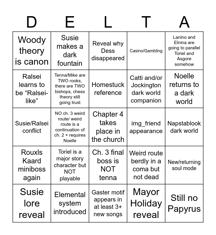 This bingo card has a free space and 24 words: Susie lore reveal, Toriel is a major story character but NOT playable, Homestuck reference, Mayor Holiday reveal, Lanino and Elnina are going to parallel Toriel and Asgore somehow, Woody theory is canon, Susie makes a dark fountain, Reveal why Dess disappeared, img_friend appearance, Napstablook dark world, Susie/Ralsei conflict, Tenna/Mike are TWO rooks, there are TWO bishops, chess theory still going trust, Weird route berdly in a coma but not dead, New/returning soul mode, Ralsei learns to be “Ralsei-like”, Elemental system introduced, Gaster motif appears in at least 3+ new songs, Casino/Gambling, Noelle returns to a dark world, Rouxls Kaard miniboss again, NO ch. 3 weird route/ weird route is a continuation of ch. 2 + requires Noelle, Ch. 3 final boss is NOT tenna, Catti and/or Jockington dark world companion and Still no Papyrus.