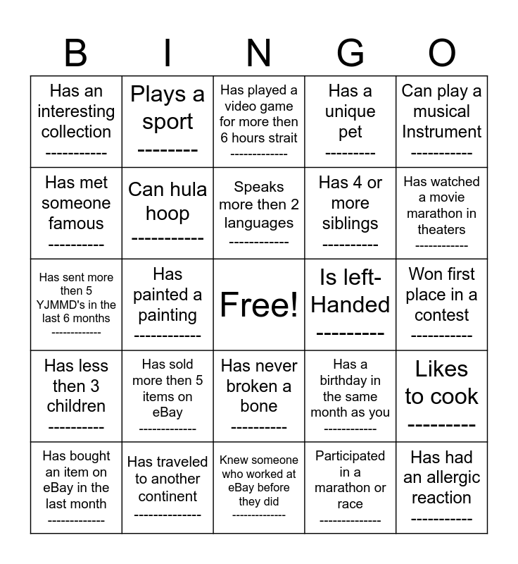This bingo card has a free space and 24 words: Has sold more then 5 items on eBay -------------, Has traveled to another continent --------------, Speaks more then 2 languages ------------, Has bought an item on eBay in the last month -------------, Can play a musical Instrument -----------, Has an interesting collection -----------, Has met someone famous ----------, Plays a sport --------, Is left- Handed ---------, Has never broken a bone ----------, Has 4 or more siblings ----------, Has sent more then 5 YJMMD's in the last 6 months -------------, Has a birthday in the same month as you ------------, Likes to cook ---------, Can hula hoop -----------, Participated in a marathon or race --------------, Won first place in a contest -----------, Has played a video game for more then 6 hours strait -------------, Has watched a movie marathon in theaters ------------, Has painted a painting ------------, Has had an allergic reaction -----------, Has less then 3 children ----------, Has a unique pet --------- and Knew someone who worked at eBay before they did --------------.