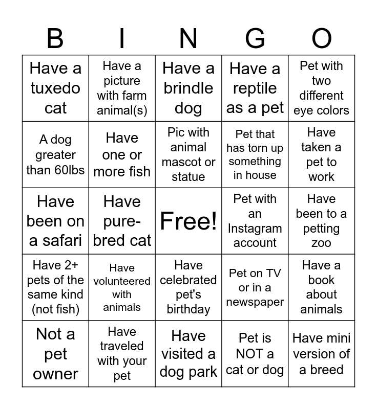 This bingo card has a free space and 29 words: Not a pet owner, Have 3+ pets of any kind, Have pure-bred cat, Have dressed pet in a costume, Have a tuxedo cat, Have a brindle dog, Have one or more fish, Have volunteered with animals, Pet with an Instagram account, Have traveled with your pet, Have been to a petting zoo, Have mini version of a breed, Have visited a dog park, Pet is NOT a cat or dog, Have taken a pet to work, Pet that sleeps in owner’s bed, Have celebrated pet's birthday, Have 2+ pets of the same kind (not fish), Pet with two different eye colors, Have been on a safari, Pet on TV or in a newspaper, Pet with favorite toy, Pet that has torn up something in house, A dog greater than 60lbs, Have a reptile as a pet, Have a picture with farm animal(s), Have a book about animals, Pic with animal mascot or statue and Pet’s name doesn’t end in a vowel.
