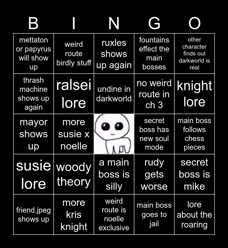 This bingo card has a free space and 24 words: woody theory, more kris knight, undine in darkworld, friend.jpeg shows up, other character finds out darkworld is real, mettaton or papyrus will show up, thrash machine shows up again, weird route birdly stuff, secret boss has new soul mode, a main boss is silly, no weird route in ch 3, mayor shows up, rudy gets worse, secret boss is mike, ralsei lore, main boss goes to jail, main boss follows chess pieces, ruxles shows up again, knight lore, more susie x noelle, lore about the roaring, susie lore, fountains effect the main bosses and weird route is noelle exclusive.
