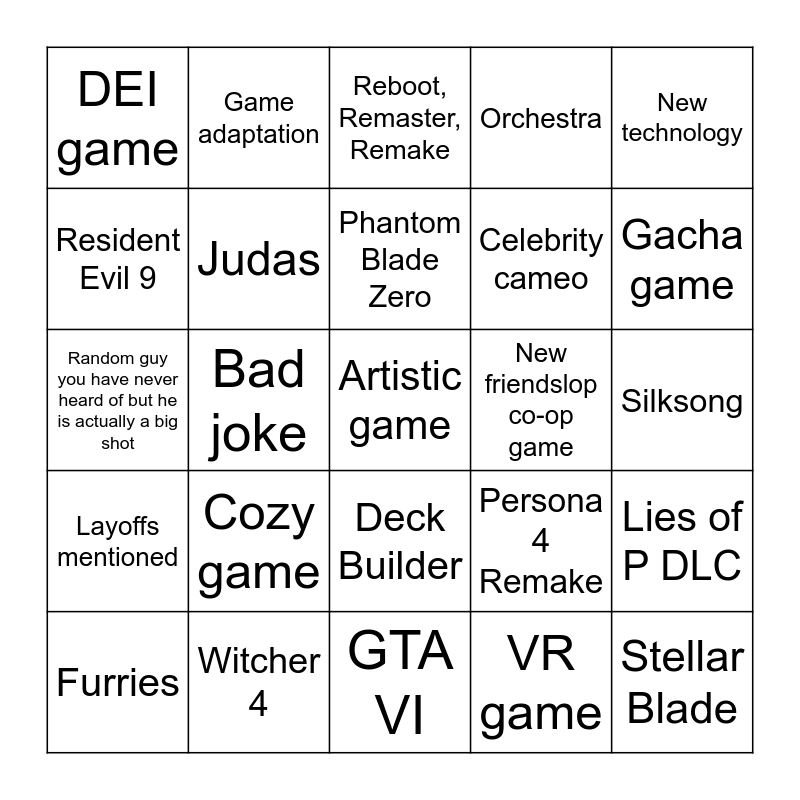 This bingo card has 25 words: Layoffs mentioned, Witcher 4, Artistic game, VR game, New technology, DEI game, Game adaptation, Reboot, Remaster, Remake, New friendslop co-op game, Lies of P DLC, Resident Evil 9, Judas, GTA VI, Persona 4 Remake, Gacha game, Furries, Bad joke, Phantom Blade Zero, Celebrity cameo, Silksong, Random guy you have never heard of but he is actually a big shot, Cozy game, Deck Builder, Orchestra and Stellar Blade.