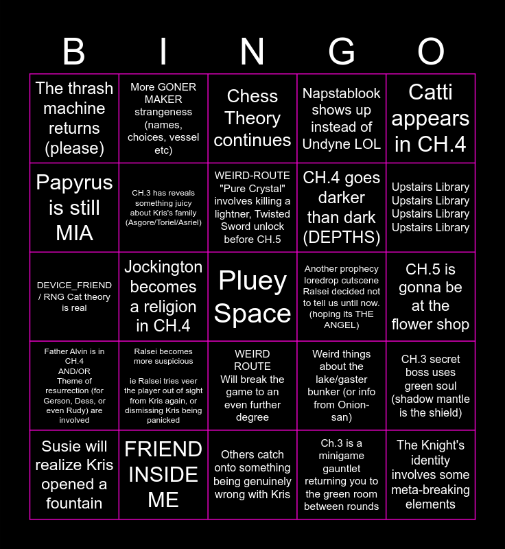 This bingo card has a free space and 24 words: Ralsei becomes more suspicious ie Ralsei tries veer the player out of sight from Kris again, or dismissing Kris being panicked, FRIEND INSIDE ME, WEIRD-ROUTE "Pure Crystal" involves killing a lightner, Twisted Sword unlock before CH.5, Susie will realize Kris opened a fountain, Catti appears in CH.4, The thrash machine returns (please), Papyrus is still MIA, More GONER MAKER strangeness (names, choices, vessel etc), Another prophecy loredrop cutscene Ralsei decided not to tell us until now. (hoping its THE ANGEL), WEIRD ROUTE Will break the game to an even further degree, CH.4 goes darker than dark (DEPTHS), DEVICE_FRIEND / RNG Cat theory is real, Weird things about the lake/gaster bunker (or info from Onion-san), CH.3 secret boss uses green soul (shadow mantle is the shield), CH.3 has reveals something juicy about Kris's family (Asgore/Toriel/Asriel), Ch.3 is a minigame gauntlet returning you to the green room between rounds, CH.5 is gonna be at the flower shop, Chess Theory continues, Upstairs Library Upstairs Library Upstairs Library Upstairs Library, Jockington becomes a religion in CH.4, The Knight's identity involves some meta-breaking elements, Father Alvin is in CH.4 AND/OR Theme of resurrection (for Gerson, Dess, or even Rudy) are involved, Napstablook shows up instead of Undyne LOL and Others catch onto something being genuinely wrong with Kris.