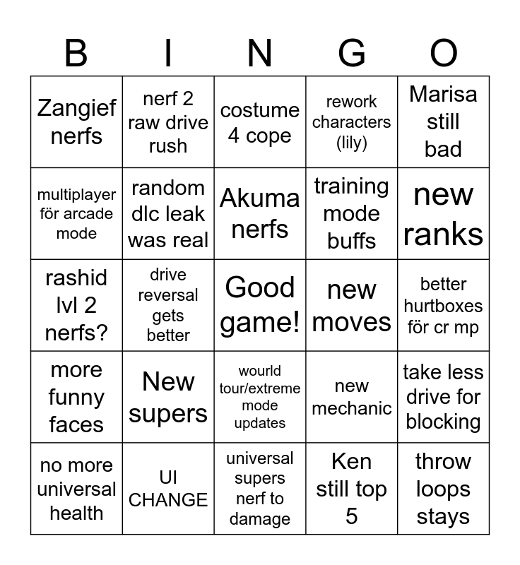 This bingo card has a free space and 24 words: New supers, UI CHANGE, Akuma nerfs, no more universal health, Marisa still bad, Zangief nerfs, multiplayer för arcade mode, nerf 2 raw drive rush, new moves, wourld tour/extreme mode updates, training mode buffs, rashid lvl 2 nerfs?, new mechanic, take less drive for blocking, random dlc leak was real, Ken still top 5, better hurtboxes för cr mp, costume 4 cope, new ranks, drive reversal gets better, throw loops stays, more funny faces, rework characters (lily) and universal supers nerf to damage.