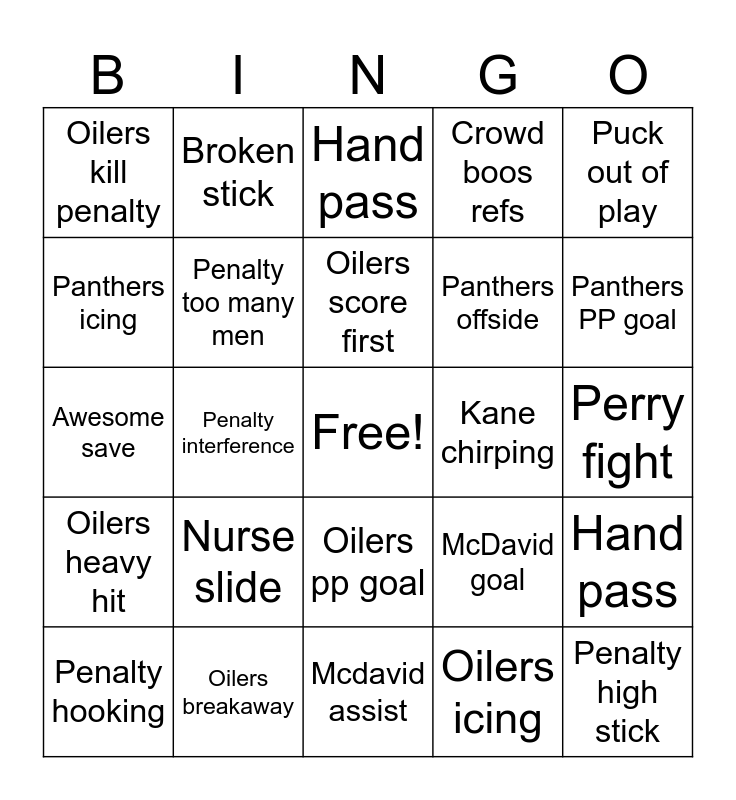 This bingo card has a free space and 29 words: Penalty hooking, R N-H Any point, Penalty interference, Leon no-look pass, Oilers kill penalty, Hand pass, Penalty too many men, Nurse slide, Kane chirping, Oilers breakaway, Perry fight, Penalty high stick, Mcdavid assist, Oilers icing, Panthers PP goal, Penalty delay of game, Oilers pp goal, Oilers heavy hit, Puck out of play, Awesome save, McDavid goal, Oilers offside, Panthers offside, Panthers icing, Crowd boos refs, Broken stick, Hand pass, Oilers score first and Penalty slashing.