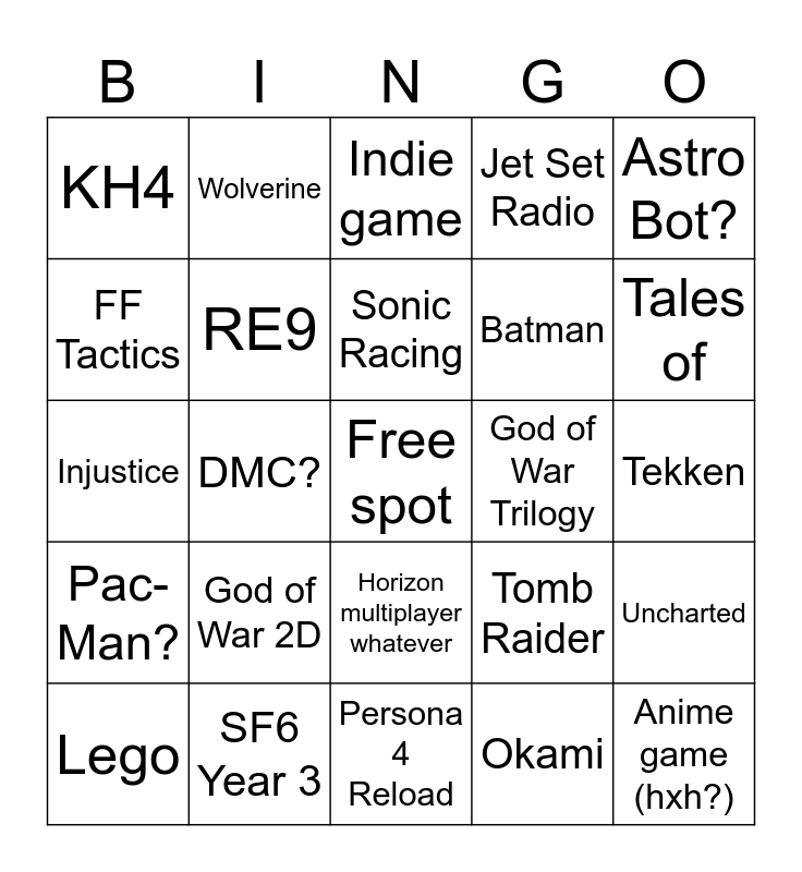 This bingo card has a free space and 24 words: God of War 2D, SF6 Year 3, Sonic Racing, Lego, Astro Bot?, KH4, FF Tactics, Wolverine, God of War Trilogy, Horizon multiplayer whatever, Batman, Injustice, Tomb Raider, Uncharted, RE9, Okami, Tekken, Indie game, Tales of, DMC?, Anime game (hxh?), Pac-Man?, Jet Set Radio and Persona 4 Reload.
