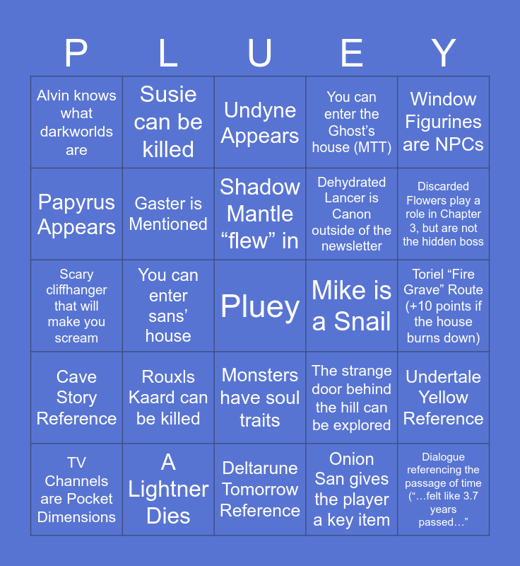 This bingo card has a free space and 24 words: Rouxls Kaard can be killed, A Lightner Dies, Shadow Mantle “flew” in, TV Channels are Pocket Dimensions, Window Figurines are NPCs, Alvin knows what darkworlds are, Papyrus Appears, Susie can be killed, Mike is a Snail, Monsters have soul traits, Dehydrated Lancer is Canon outside of the newsletter, Scary cliffhanger that will make you scream, The strange door behind the hill can be explored, Undertale Yellow Reference, Gaster is Mentioned, Onion San gives the player a key item, Toriel “Fire Grave” Route (+10 points if the house burns down), Undyne Appears, Discarded Flowers play a role in Chapter 3, but are not the hidden boss, You can enter sans’ house, Dialogue referencing the passage of time (“…felt like 3.7 years passed…”, Cave Story Reference, You can enter the Ghost’s house (MTT) and Deltarune Tomorrow Reference.