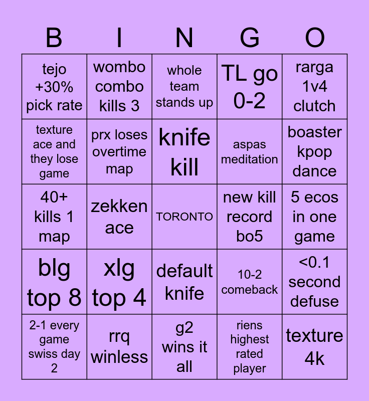 This bingo card has a free space and 24 words: xlg top 4, rrq winless, knife kill, 2-1 every game swiss day 2, rarga 1v4 clutch, tejo +30% pick rate, texture ace and they lose game, wombo combo kills 3, new kill record bo5, default knife, aspas meditation, 40+ kills 1 map, 10-2 comeback, <0.1 second defuse, prx loses overtime map, riens highest rated player, 5 ecos in one game, whole team stands up, boaster kpop dance, zekken ace, texture 4k, blg top 8, TL go 0-2 and g2 wins it all.