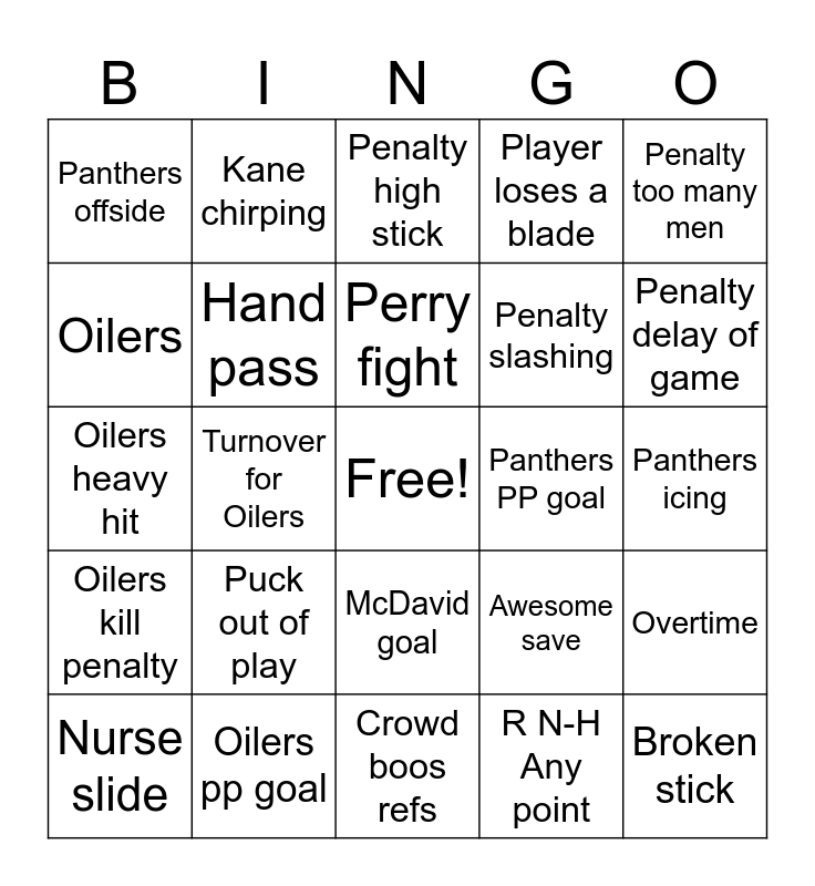 This bingo card has a free space and 34 words: Penalty hooking, R N-H Any point, Penalty interference, Leon no-look pass, Oilers kill penalty, Hand pass, Penalty too many men, Nurse slide, Kane chirping, Oilers breakaway, Perry fight, Penalty high stick, McDavid assist, Oilers icing, Panthers PP goal, Penalty delay of game, Oilers pp goal, Oilers heavy hit, Puck out of play, Awesome save, McDavid goal, Oilers offside, Panthers offside, Panthers icing, Crowd boos refs, Broken stick, Player loses a blade, Oilers score first, Penalty slashing, Oilers, Bouch Bomb!, Turnover for Oilers, Overtime and Jack Michaels one-liner.