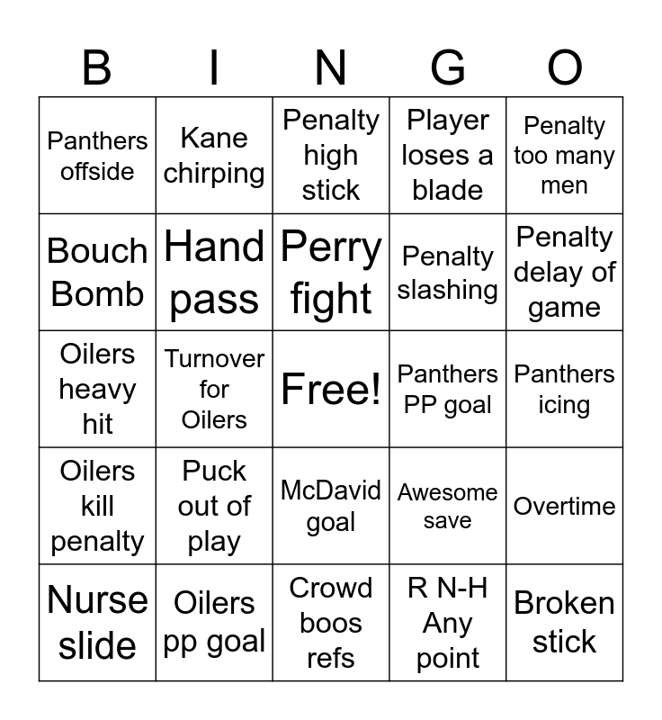 This bingo card has a free space and 34 words: Penalty hooking, R N-H Any point, Penalty interference, Leon no-look pass, Oilers kill penalty, Hand pass, Penalty too many men, Nurse slide, Kane chirping, Oilers breakaway, Perry fight, Penalty high stick, McDavid assist, Oilers icing, Panthers PP goal, Penalty delay of game, Oilers pp goal, Oilers heavy hit, Puck out of play, Awesome save, McDavid goal, Oilers offside, Panthers offside, Panthers icing, Crowd boos refs, Broken stick, Player loses a blade, Oilers score first, Penalty slashing, Bouch Bomb, Empty net, Turnover for Oilers, Overtime and Jack Michaels one-liner.
