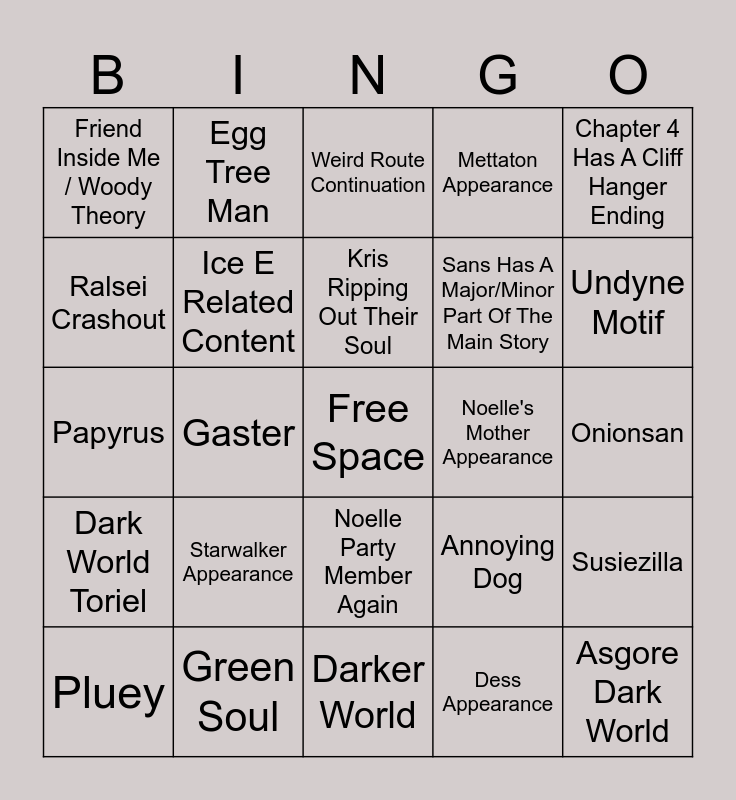 This bingo card has a free space and 24 words: Pluey, Starwalker Appearance, Kris Ripping Out Their Soul, Dess Appearance, Chapter 4 Has A Cliff Hanger Ending, Friend Inside Me / Woody Theory, Egg Tree Man, Weird Route Continuation, Noelle's Mother Appearance, Onionsan, Papyrus, Ice E Related Content, Annoying Dog, Susiezilla, Ralsei Crashout, Green Soul, Darker World, Mettaton Appearance, Undyne Motif, Dark World Toriel, Gaster, Noelle Party Member Again, Sans Has A Major/Minor Part Of The Main Story and Asgore Dark World.