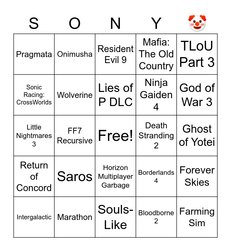 This bingo card has a free space and 29 words: Intergalactic, Fairgames, FF7 Recursive, Kingdom Hearts 4, Pragmata, Resident Evil 9, Wolverine, Saros, Death Stranding 2, Marathon, Ghost of Yotei, Farming Sim, Souls-Like, Bloodborne 2, God of War 3, Phantom Blade Zero, Horizon Multiplayer Garbage, Return of Concord, TLoU Part 3, Little Nightmares 3, Borderlands 4, MGS Delta, Ninja Gaiden 4, Sonic Racing: CrossWorlds, Mafia: The Old Country, Onimusha, Forever Skies, Lies of P DLC and Shinobi: Art of Vengeance.