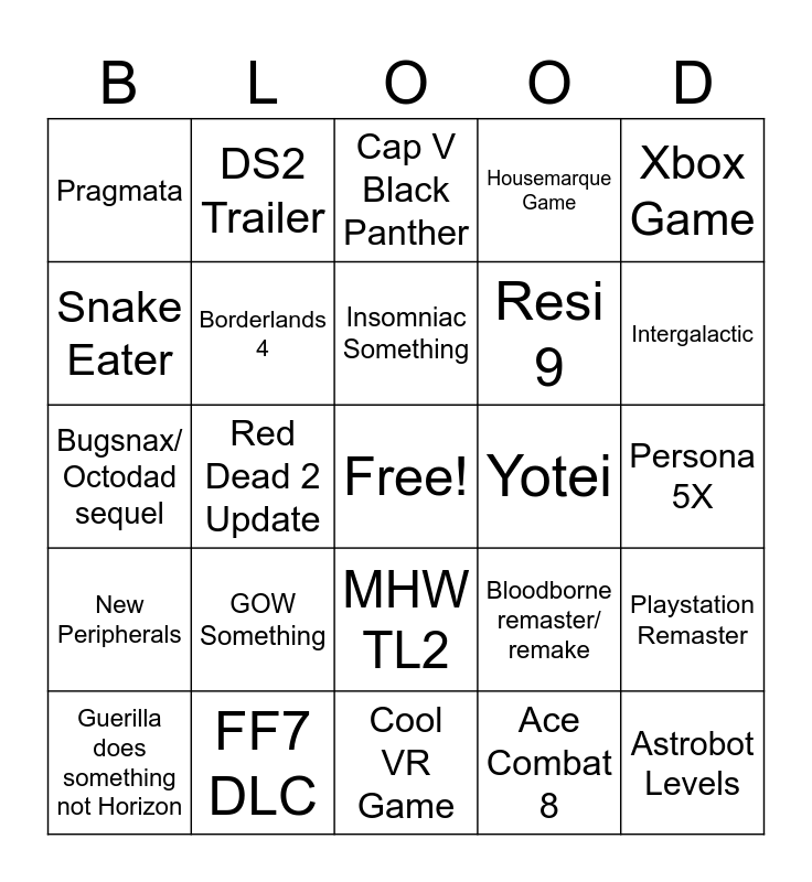 This bingo card has a free space and 24 words: GOW Something, FF7 DLC, Insomniac Something, Guerilla does something not Horizon, Xbox Game, Pragmata, Snake Eater, DS2 Trailer, Yotei, MHW TL2, Resi 9, Bugsnax/ Octodad sequel, Bloodborne remaster/ remake, Playstation Remaster, Borderlands 4, Ace Combat 8, Persona 5X, Cap V Black Panther, Intergalactic, Red Dead 2 Update, Astrobot Levels, New Peripherals, Housemarque Game and Cool VR Game.