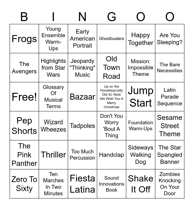 This bingo card has 36 words: Handclap, Too Much Percussion, Sound Innovations Book, The Avengers, Pep Shorts, Up on the Housetop/Jolly Old St. Nick/ We Wish You A Merry Christmas, Highlights from Star Wars, Fiesta Latina, Happy Together, Sideways Walking Dog, The Bare Necessities, Ghostbusters, The Star Spangled Banner, Glossary Of Musical Terms, Old Town Road, Frogs, The Pink Panther, Jump Start, Free!, Early American Portrait, Bazaar, Wizard Wheezes, Don't You Worry 'Bout A Thing, Tadpoles, Foundation Warm-Ups, Young Ensemble Warm-Ups, Mission: Impossible Theme, Ten Marches In Two Minutes, Jeopardy "Thinking" Music, Are You Sleeping?, Zombies Knocking On Your Door, Zero To Sixty, Sesame Street Theme, Latin Parade Sequence, Thriller and Shake It Off.