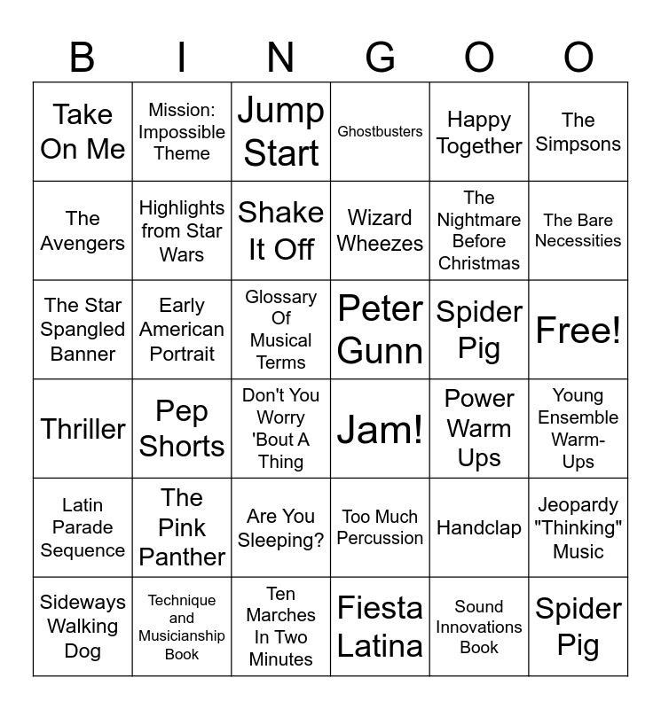 This bingo card has 37 words: Handclap, Too Much Percussion, Sound Innovations Book, The Avengers, Pep Shorts, Spider Pig, Highlights from Star Wars, Fiesta Latina, Happy Together, Sideways Walking Dog, The Bare Necessities, Ghostbusters, The Star Spangled Banner, Glossary Of Musical Terms, The Simpsons, Peter Gunn, The Pink Panther, Jump Start, Free!, Early American Portrait, Take On Me, Wizard Wheezes, Don't You Worry 'Bout A Thing, Power Warm Ups, Technique and Musicianship Book, Young Ensemble Warm-Ups, Mission: Impossible Theme, Ten Marches In Two Minutes, Jeopardy "Thinking" Music, Are You Sleeping?, Seven Nation Army, Jam!, The Nightmare Before Christmas, Latin Parade Sequence, Thriller, Shake It Off and Spider Pig.