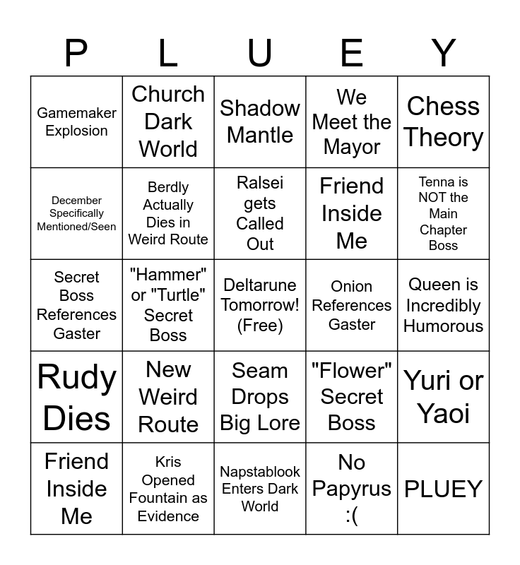 This bingo card has a free space and 24 words: New Weird Route, Kris Opened Fountain as Evidence, Ralsei gets Called Out, Friend Inside Me, Chess Theory, Gamemaker Explosion, December Specifically Mentioned/Seen, Church Dark World, Onion References Gaster, Seam Drops Big Lore, Friend Inside Me, Secret Boss References Gaster, "Flower" Secret Boss, Yuri or Yaoi, Berdly Actually Dies in Weird Route, No Papyrus :(, Queen is Incredibly Humorous, Shadow Mantle, Tenna is NOT the Main Chapter Boss, "Hammer" or "Turtle" Secret Boss, PLUEY, Rudy Dies, We Meet the Mayor and Napstablook Enters Dark World.