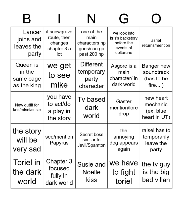 This bingo card has a free space and 24 words: see/mention Papyrus, Chapter 3 focused fully in dark world, Different temporary party character, Toriel in the dark world, asriel returns/mention, Lancer joins and leaves the party, Queen is in the same cage as the king, if snowgrave route, then changes chapter 3 a lot, Gaster mention/lore drop, Secret boss similar to Jevil/Spamton, Asgore is a main character/ in dark world, New outfit for kris/ralsei/susie, the annoying dog appears again, ralsei has to temporarily leave the party, we get to see mike, we have to fight toriel, new heart mechanic (ex. blue heart in UT), one of the main characters hp goes/can go past 200 hp, Banger new soundtrack (has to be fire....), you have to act/do a play in the story, the tv guy is the big bad villan, the story will be very sad, we look into kris's backstory before the events of deltarune and Susie and Noelle kiss.
