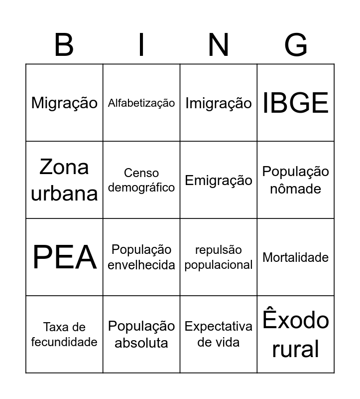 This bingo card has 31 words: Free!, Natalidade, Mortalidade, Crescimento vegetativo, Migração, Imigração, Emigração, Densidade demográfica, População absoluta, População relativa, Expectativa de vida, Taxa de fecundidade, Pirâmide etária, População jovem, População envelhecida, País desenvolvido, País subdesenvolvido, Transição demográfica, Êxodo rural, Urbanização, Zona urbana, Zona rural, IDH, Alfabetização, PEA, Censo demográfico, IBGE, repulsão populacional, atração populacional, População nômade and População fixa.