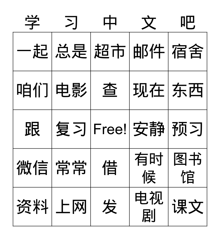 This bingo card has a free space and 24 words: 常常, 上网, 查, 资料, 宿舍, 一起, 咱们, 总是, 安静, 借, 现在, 跟, 有时候, 图书馆, 电影, 电视剧, 预习, 超市, 东西, 复习, 课文, 微信, 邮件 and 发.