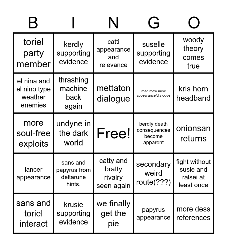 This bingo card has a free space and 24 words: sans and toriel interact, sans and papyrus from deltarune hints., mettaton dialogue, papyrus appearance, woody theory comes true, toriel party member, kerdly supporting evidence, catti appearance and relevance, berdly death consequences become apparent, onionsan returns, more soul-free exploits, thrashing machine back again, secondary weird route(???), fight without susie and ralsei at least once, el nina and el nino type weather enemies, krusie supporting evidence, we finally get the pie, suselle supporting evidence, kris horn headband, lancer appearance, undyne in the dark world, catty and bratty rivalry seen again, mad mew mew appearance/dialogue and more dess references.