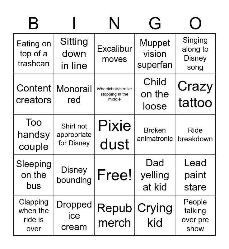 This bingo card has 26 words: Free!, Crying kid, Wheelchair/stroller stopping in the middle, Dropped ice cream, Singing along to Disney song, Eating on top of a trashcan, Content creators, Sitting down in line, Ride breakdown, Dad yelling at kid, Child on the loose, Too handsy couple, Lead paint stare, Clapping when the ride is over, Shirt not appropriate for Disney, Feeding animals at park, Muppet vision superfan, Sleeping on the bus, Excalibur moves, Pixie dust, Crazy tattoo, Repub merch, Broken animatronic, Disney bounding, Monorail red and People talking over pre show.