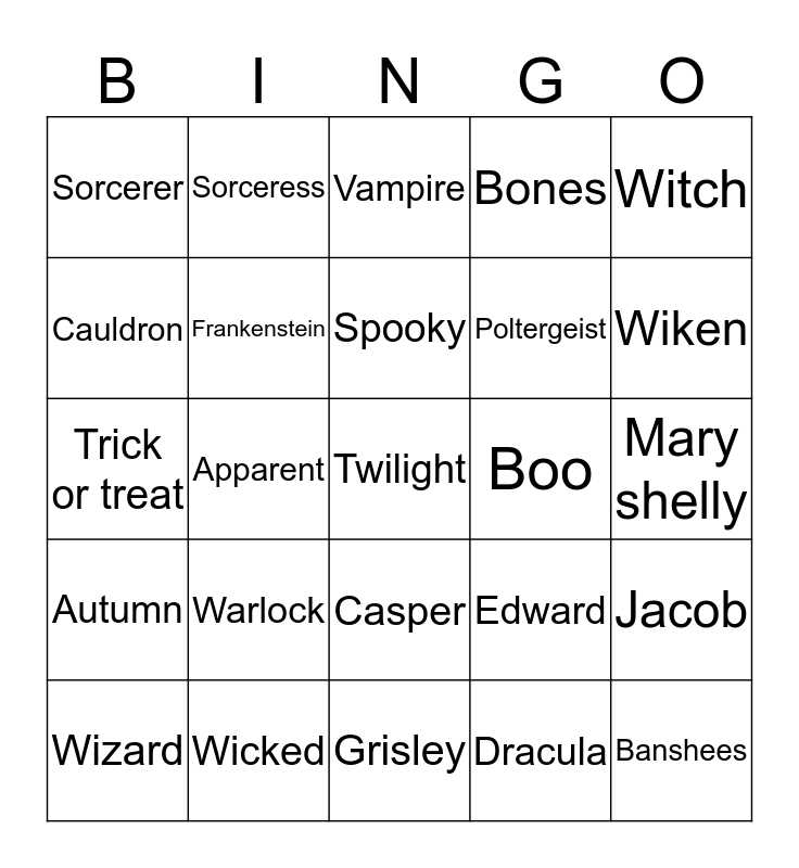 This bingo card has a free space and 24 words: Warlock, Wicked, Spooky, Wizard, Witch, Sorcerer, Cauldron, Sorceress, Boo, Casper, Poltergeist, Trick or treat, Edward, Jacob, Frankenstein, Dracula, Mary shelly, Vampire, Wiken, Apparent, Banshees, Autumn, Bones and Grisley.