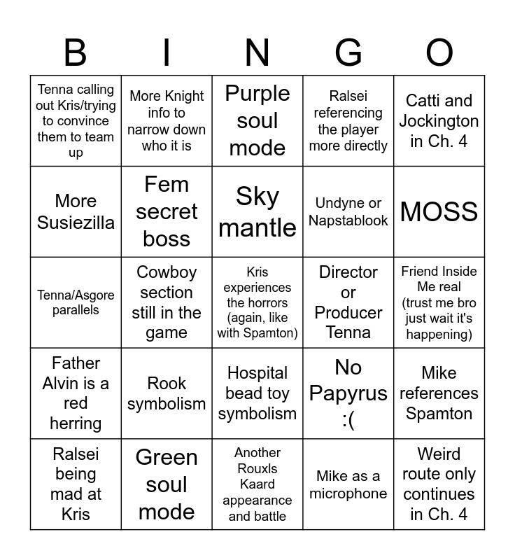 This bingo card has a free space and 24 words: Rook symbolism, Green soul mode, Sky mantle, Ralsei being mad at Kris, Catti and Jockington in Ch. 4, Tenna calling out Kris/trying to convince them to team up, More Susiezilla, More Knight info to narrow down who it is, Director or Producer Tenna, Hospital bead toy symbolism, Undyne or Napstablook, Tenna/Asgore parallels, No Papyrus :(, Mike references Spamton, Fem secret boss, Mike as a microphone, Friend Inside Me real (trust me bro just wait it's happening), Purple soul mode, MOSS, Cowboy section still in the game, Weird route only continues in Ch. 4, Father Alvin is a red herring, Ralsei referencing the player more directly and Another Rouxls Kaard appearance and battle.