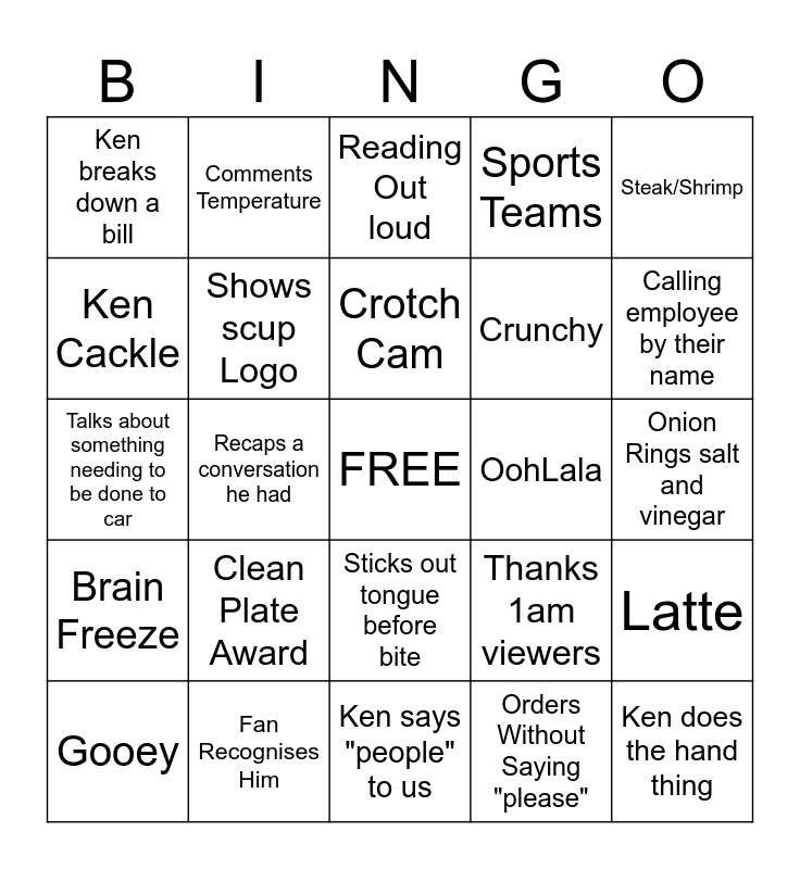 This bingo card has a free space and 25 words: Clean Plate Award, Ken says "people" to us, Crotch Cam, Gooey, Steak/Shrimp, Ken breaks down a bill, Ken Cackle, Comments Temperature, OohLala, Sticks out tongue before bite, Crunchy, Talks about something needing to be done to car, Thanks 1am viewers, Latte, Shows scup Logo, Bonus Fries, Onion Rings salt and vinegar, Reading Out loud, Calling employee by their name, Recaps a conversation he had, Ken does the hand thing, Fan Recognises Him, Brain Freeze, Sports Teams and Orders Without Saying "please".