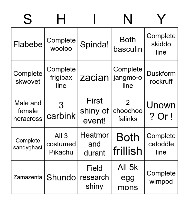 This bingo card has a free space and 24 words: All 3 costumed Pikachu, Shundo, zacian, Zamazenta, Complete skiddo line, Flabebe, Complete skwovet, Complete wooloo, 2 choochoo falinks, Heatmor and durant, Complete jangmo-o line, Male and female heracross, Both frillish, Complete cetoddle line, Complete frigibax line, All 5k egg mons, Unown ? Or !, Spinda!, Duskform rockruff, 3 carbink, Complete wimpod, Complete sandyghast, Both basculin and Field research shiny.